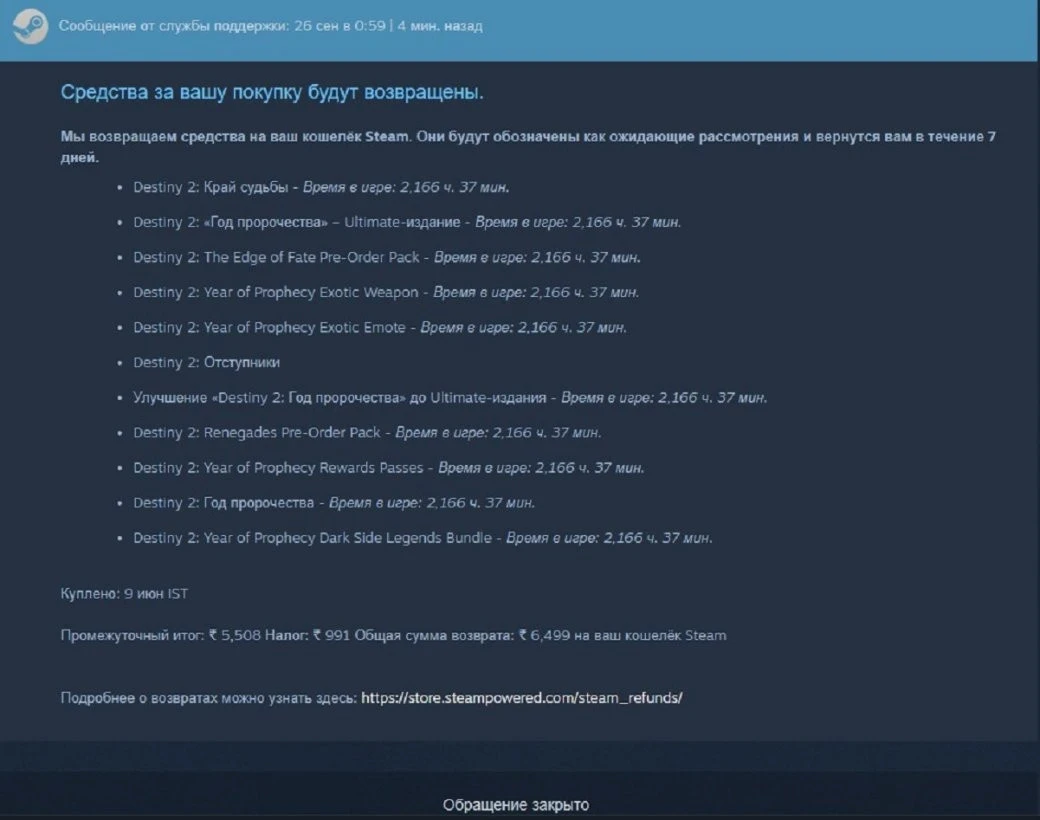 Примеры успешных обращений поклонников Destiny 2 в техподдержку Steam