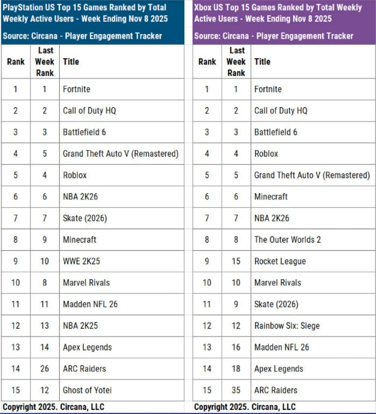 Вероятно, Circana собирает данные по активности компьютерных игроков в Steam, поскольку на консолях лидерами остаются Fortnite и «хаб» Call of Duty. Там же в списке есть, например, Roblox — песочница занимает пятое и четвёртое места на PlayStation 5 и Xbox Series соответственно. А шутер ARC Raiders смог войти в топ-15. На PS5 он занял 14-ю строчку по активности, опередив Ghost of Yotei.