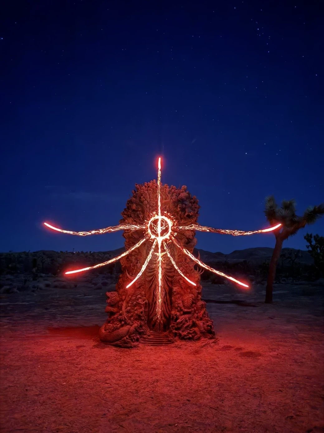 Настоящую статую нашли в пустыне Мохаве, по координатам, которые опубликовал аккаунт TGA. Смотрите, она светится в ночное время.