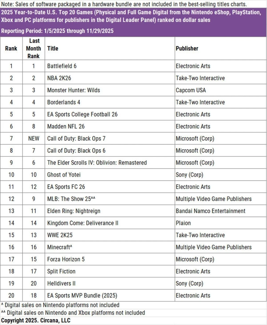 Главная » Статьи » Battlefield 6, NBA и Monster Hunter сохраняют лидерство по продажам в 2025 году в США