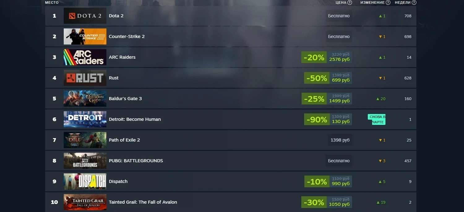 Кроме того, в чарт снова вернулась Detroit: Become Human, Dispatch и Tainted Grail: The Fall of Avalon. В первом и третьем случаях спасибо в том числе большим скидкам.