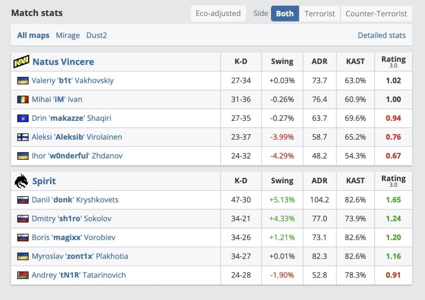 • Его разница убийств и смертей составила +17, а средний урон за раунд (ADR) достиг отметки 98.6.