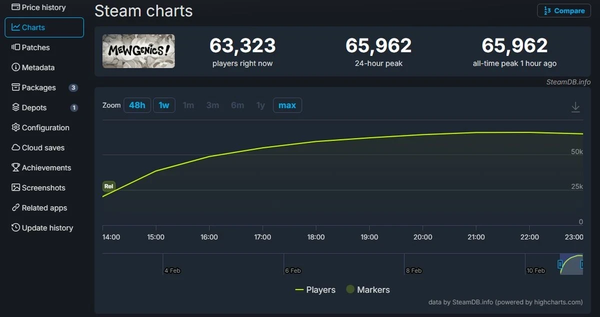 Пиковый онлайн тоже продолжает расти с момента релиза. Сейчас он составляет 65,962 одновременных игрока, причём рекорд обновился час назад.