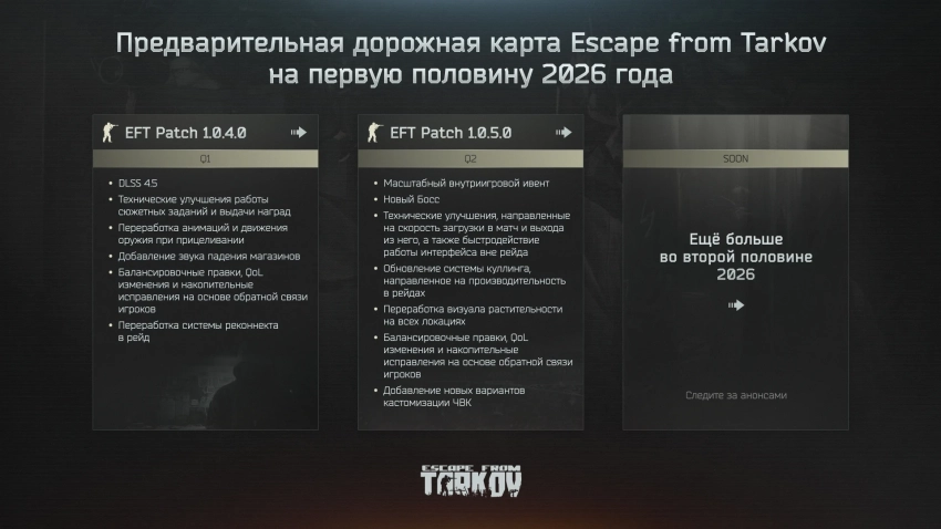 Обложка: скриншот Escape from TarkovРазработчики Escape from Tarkov опубликовали дорожную карту с планами на первую половину 2026 года. В ней содержатся два больших патча.