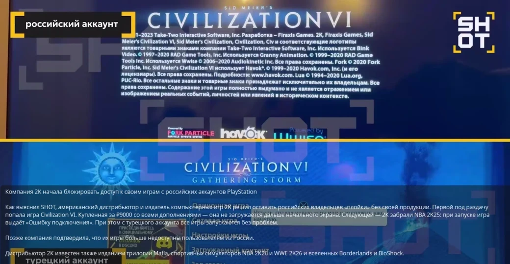 В частности, упоминаются Sid Meier’s Civilization VI и NBA 2K25. Первая «не загружает дальше начального экрана», а вторая выдаёт ошибку подключения. SHOT также утверждает, что компания «подтвердила недоступность своих игр пользователям из России».