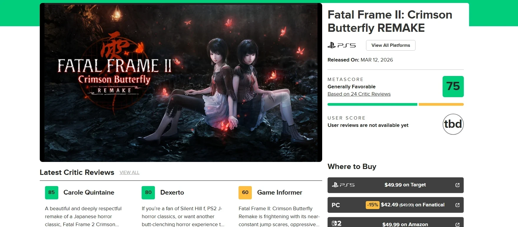 «Пусть и не безупречная фотография, Fatal Frame II: Crimson Butterfly Remake — это запоминающаяся, ужасающая и потрясающе красивая игра», — 80 баллов, IGN.
