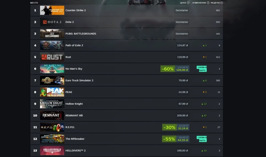 Что касается российского региона, то лидирующие позиции занимает ряд условно-бесплатных игр. Лишь на четвёртой строчке расположилась Path of Exile 2, которая сумела обогнать выживалку Rust. Упомянутая выше No Man’s Sky смогла вернуться в чарт на шестое место, тогда как метроидвания Hollow Knight поднялась на 22 позиции вплоть до девятой строчки — игроки хотят пройти первую часть перед релизом сиквела.